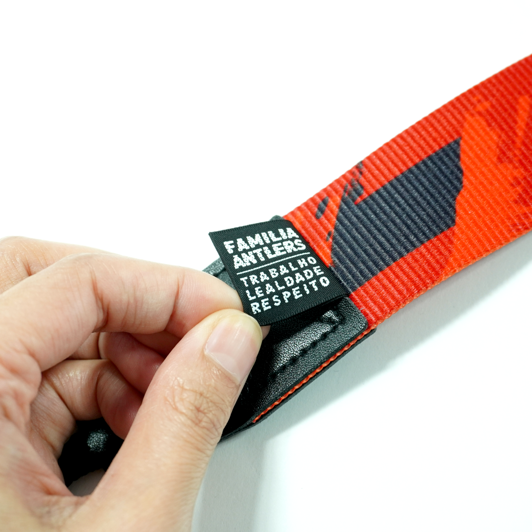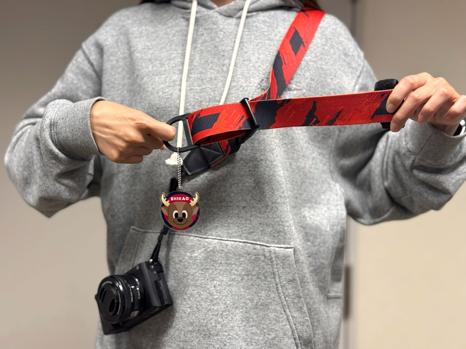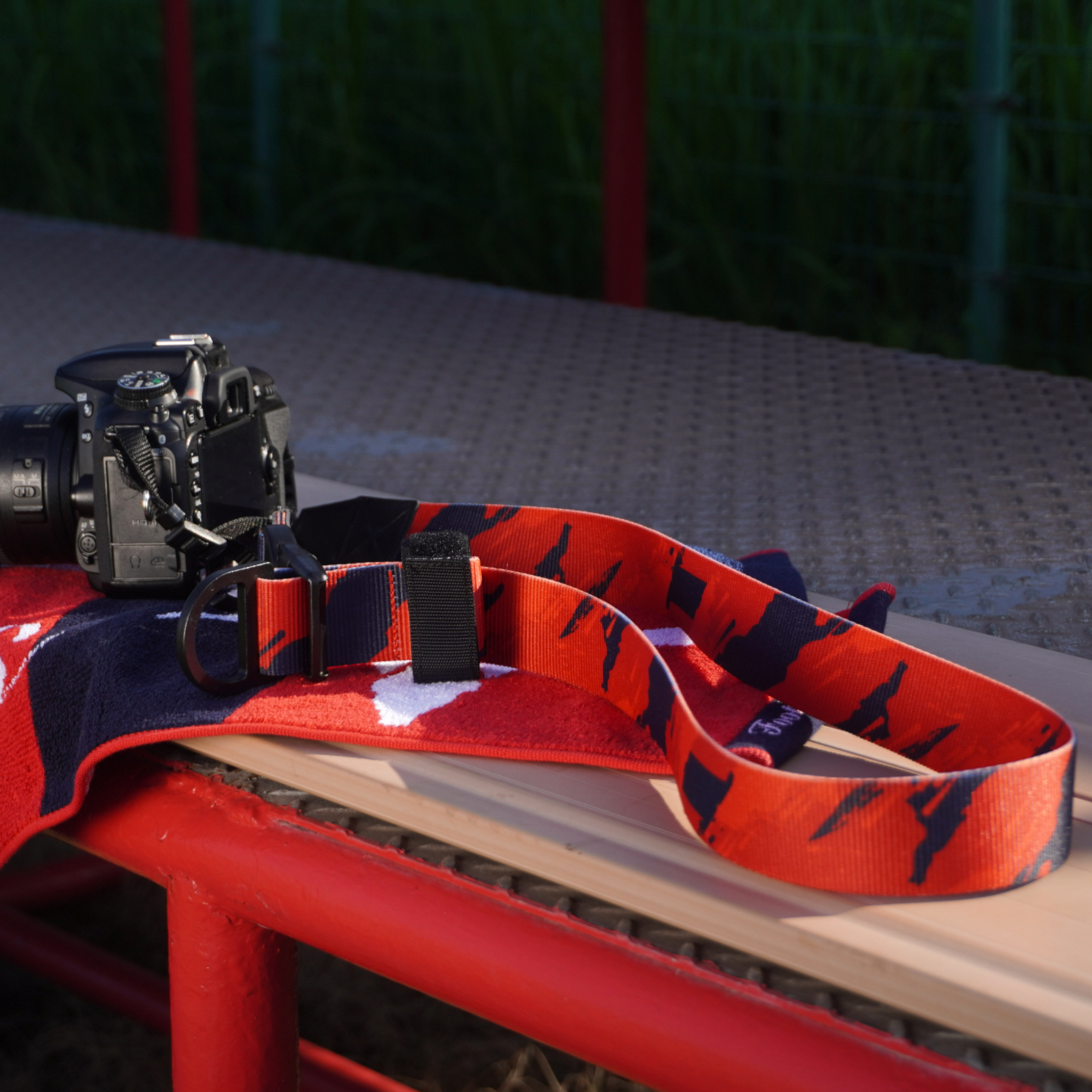 端部にはピスタグを織り込み、細部にも鹿島アントラーズを宿しています。単なるアクセサリーではなく、重量級カメラ機材を扱うための装備として設計しています。長時間携行時の快適性、アクセスの速さ、体への負担軽減、そしてクラブアイデンティティの表現。