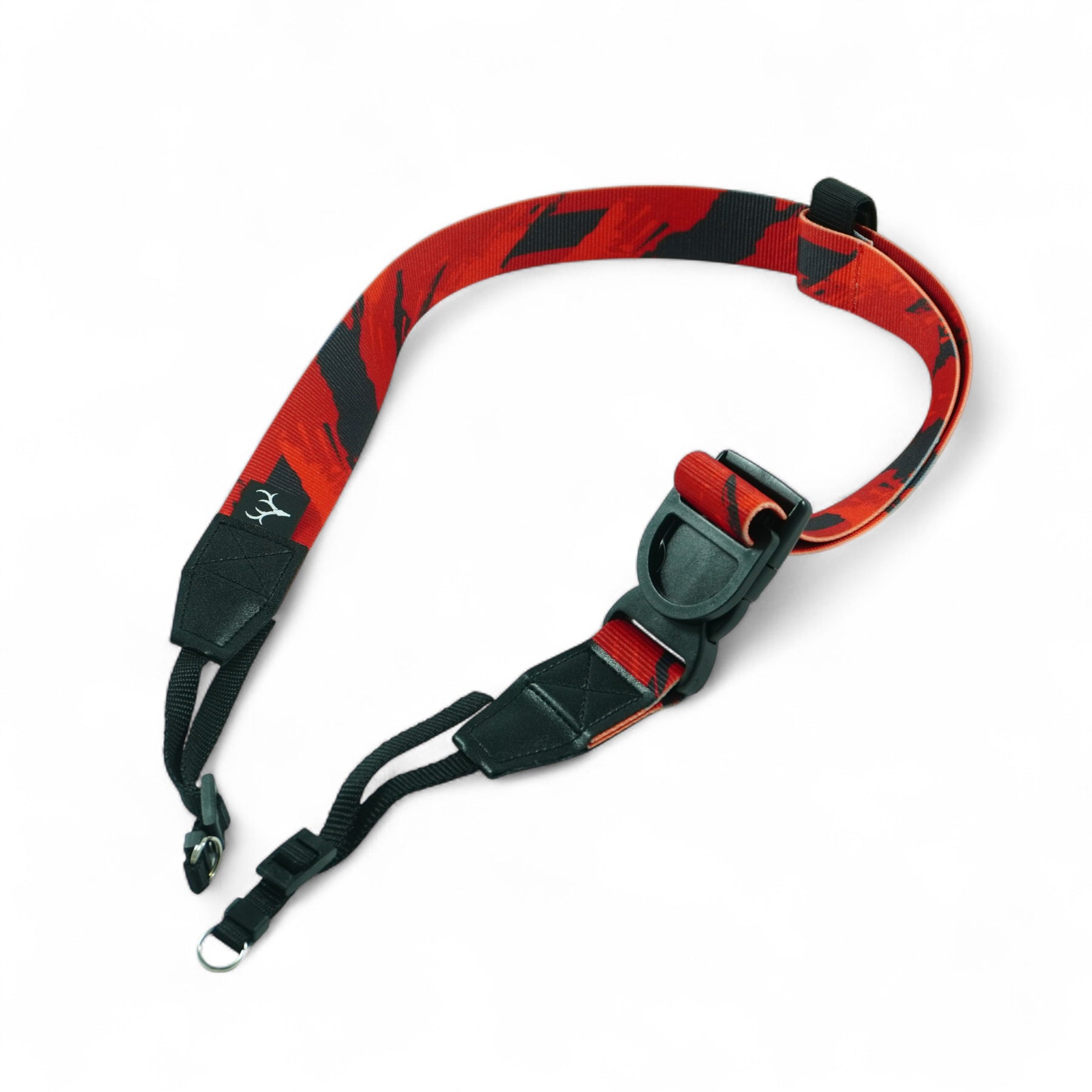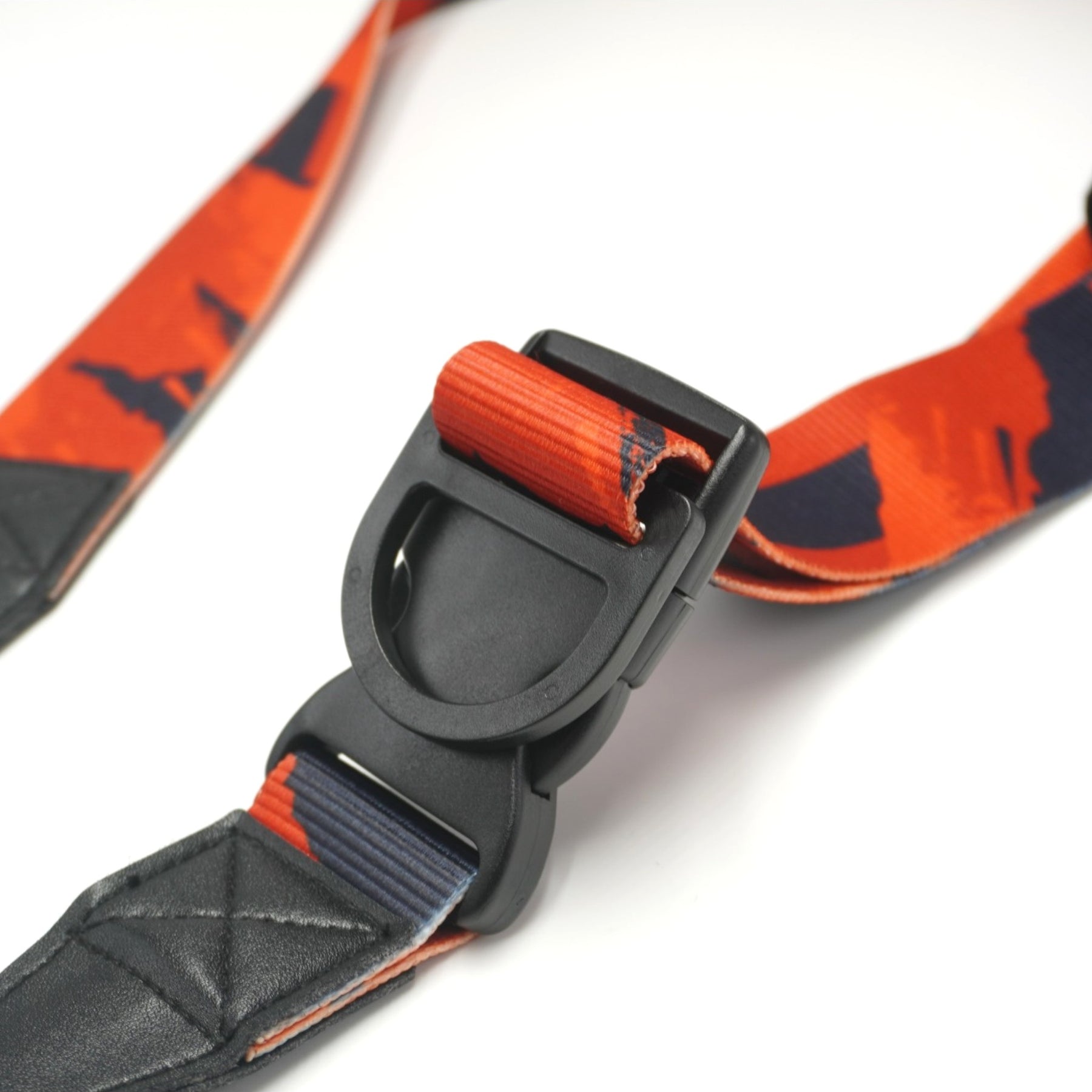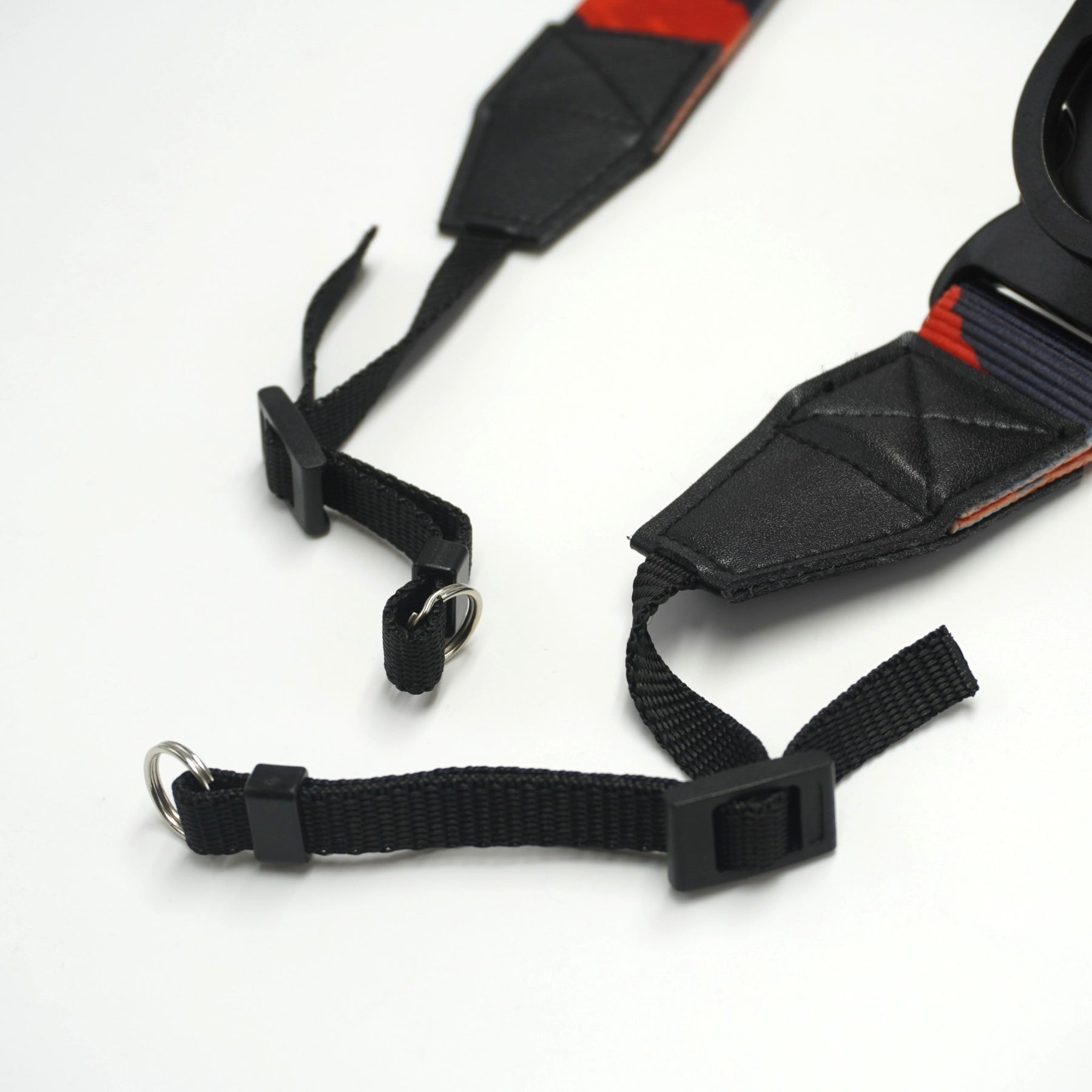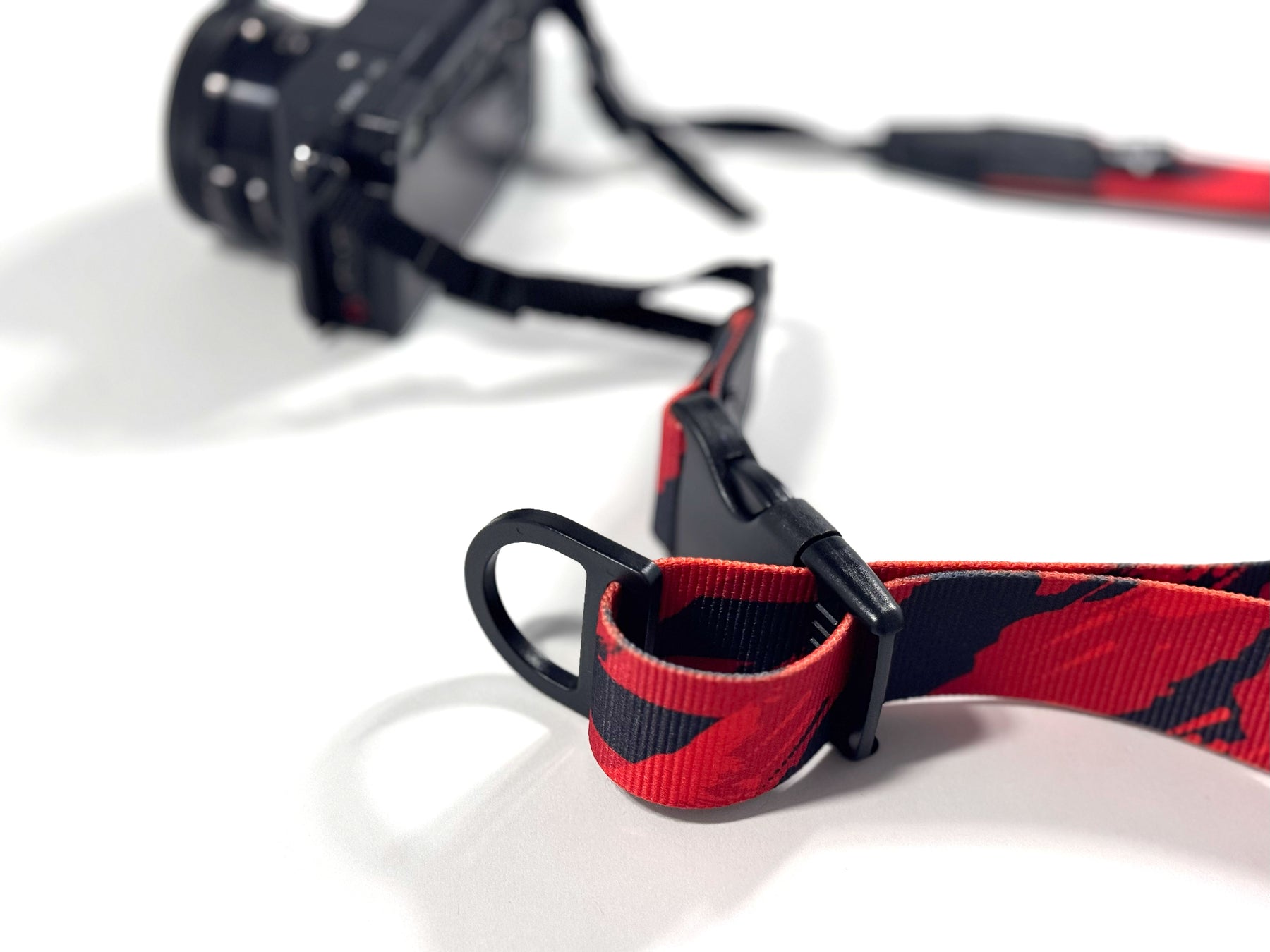 重量機材を想定し、負荷に耐えるウェビングとパーツ構成を採用しています。長さ調整は片手で滑らかに行える設計となっています。機材を身体に固定して安定させる状態と、素早く構えに移行する状態を、動作を止めずに切り替えられます。移動、立ち座り、階段の昇降、満席スタンド内での姿勢変更など、多様な動きに対してストレスを抑えます。