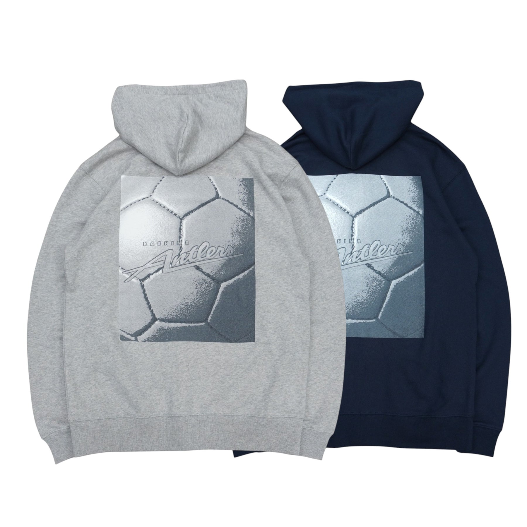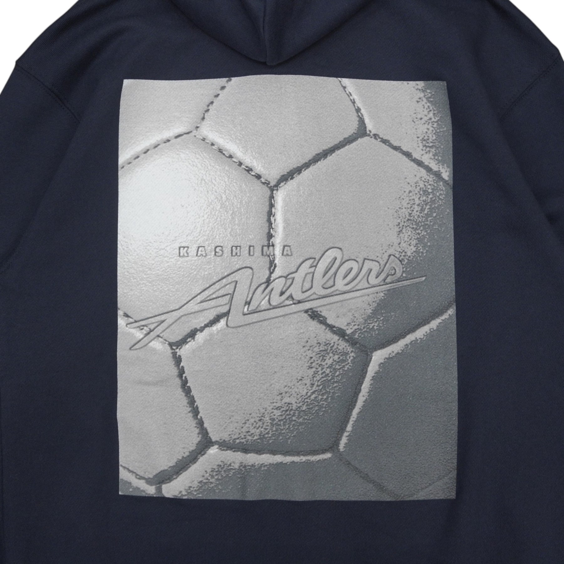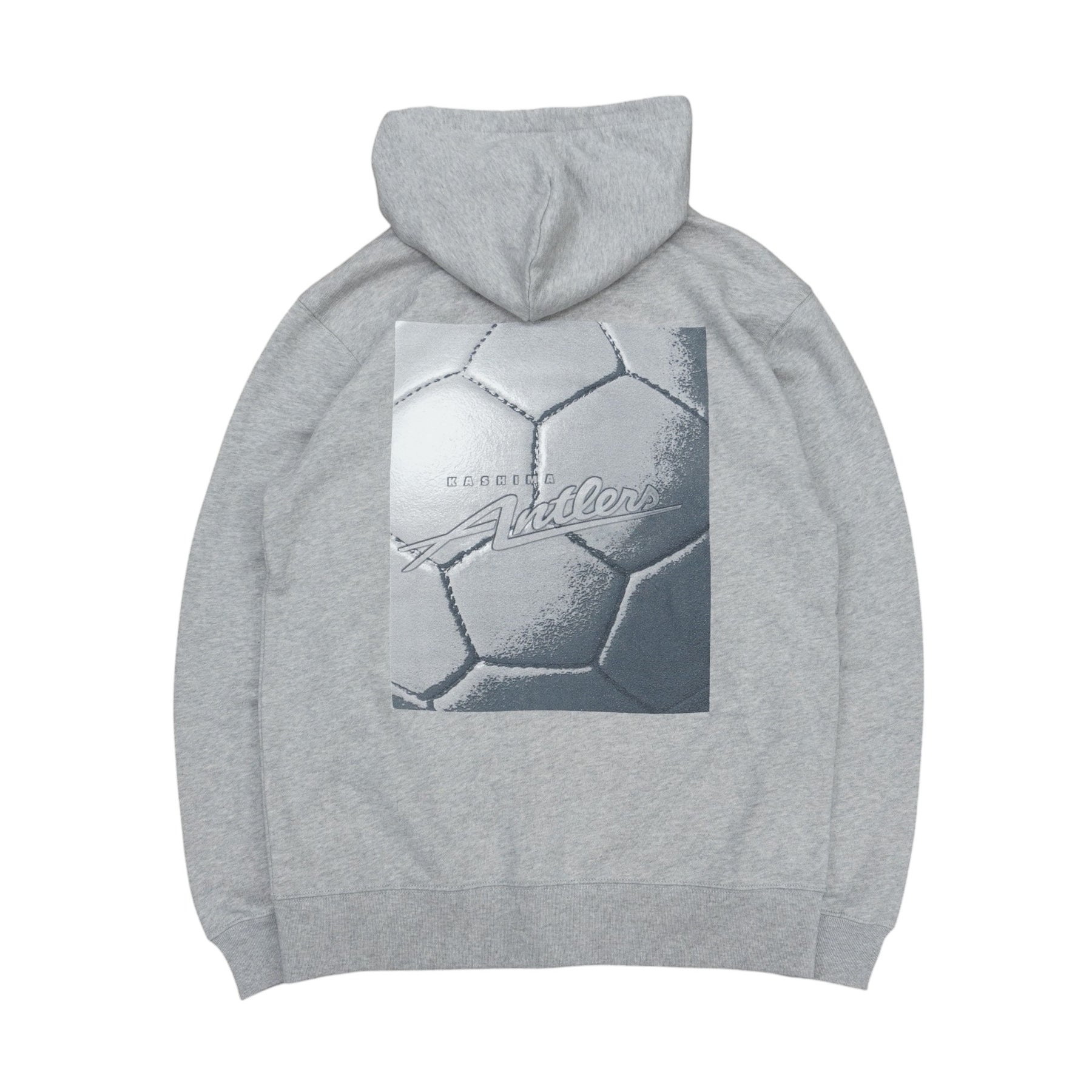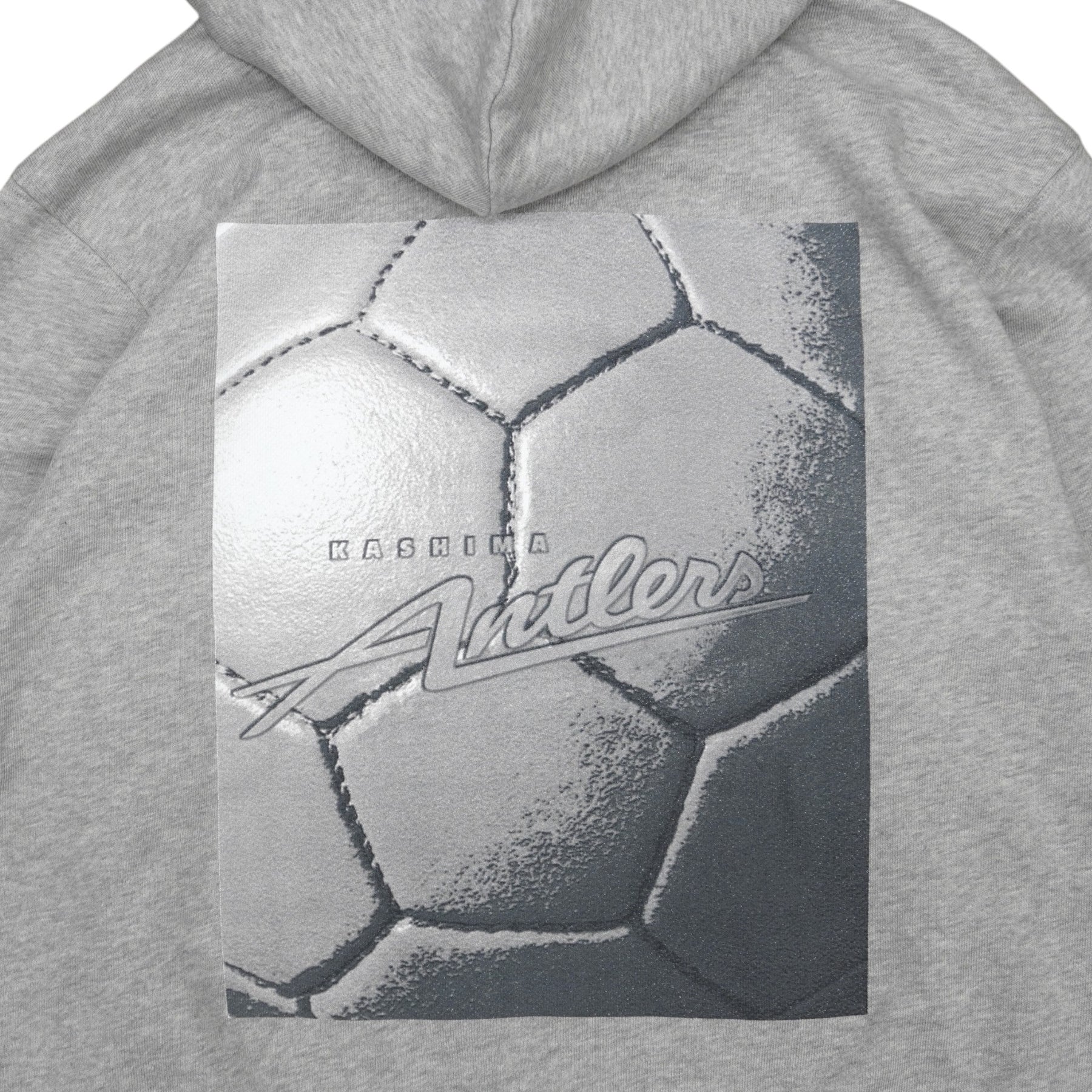 サッカーボールのバッグプリントが印象的なジップフーディです。