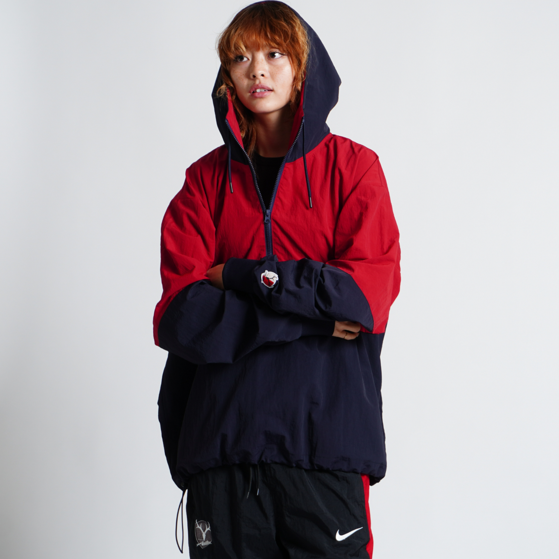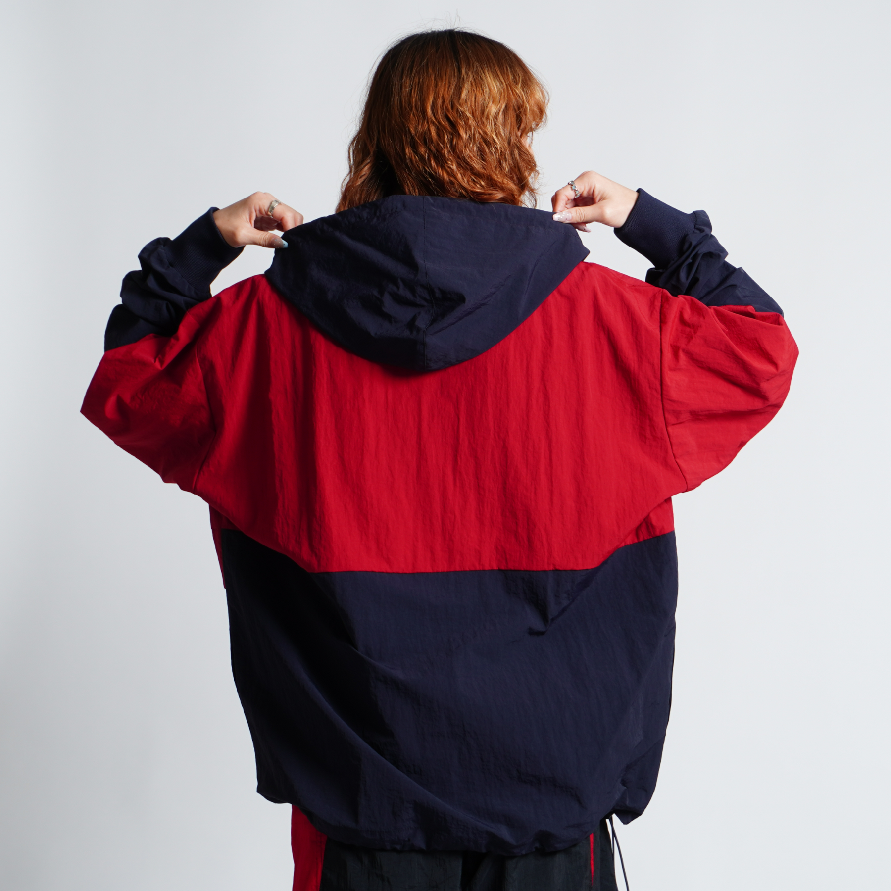 大胆なバイカラーで切り替えられたアノラックジャケットが登場。上下で異なる色が生み出すコントラストが、スタイリングに奥行きを与えます。動きの中で際立つデザイン。